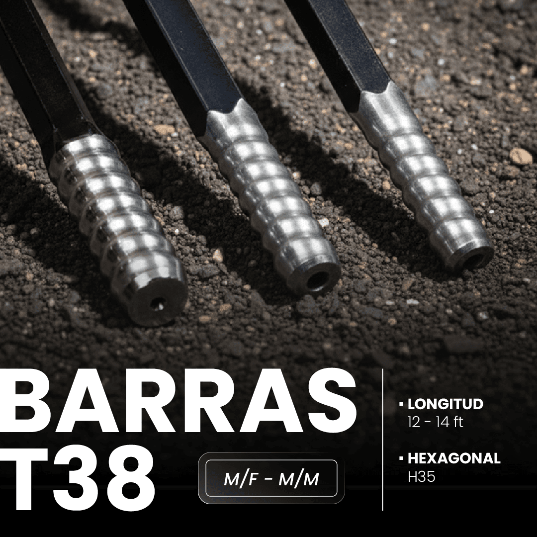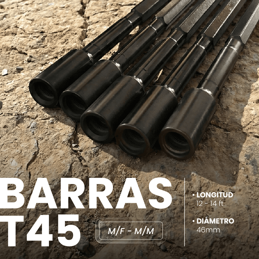 Las barras de perforación con rosca T45 y un diámetro de 46 mm están fabricadas para soportar las más altas exigencias en operaciones de avance y producción mecanizada con Jumbos. Presentadas en longitudes de 12 a 14 pies con acoplamientos M/F (Macho/Hembra) o M/M (Macho/Macho), ofrecen una excepcional resistencia a la fatiga y precisión en el barrenado. Este producto ofrece una máxima versatilidad comercial al estar disponible bajo nuestra selección multimarca, trabajando con los líderes de la industria: Shen Li, ONEDRILL, Mitsubishi, HydroBit, Boart Longyear, Atlas Copco, Sandvik, Epiroc y Hyundai.